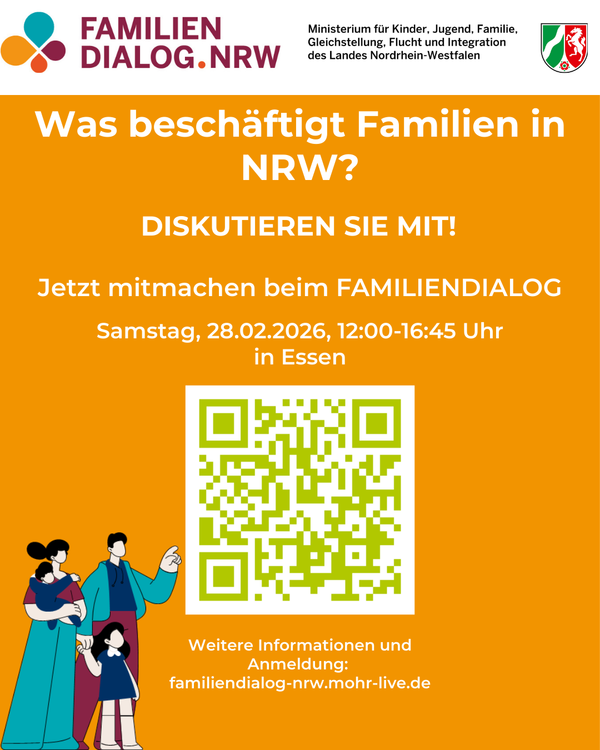 Gerne möchten wir Sie auf den für alle Familien offenen Familiendialog aufmerksam machen. Die Veranstaltung findet im Rahmen des Begleitprozesses zur Erarbeitung des Familienberichtes NRW statt und bietet Raum, um den Alltag, die Lebenslagen und die Herausforderungen von Familien gemeinsam in den Blick zu nehmen. Zusammen mit Familienministerin Verena Schäffer werden aktuelle Themen, unterschiedliche Lebenssituationen, Unterstützungswege sowie bestehende Angebote und weiterer Handlungsbedarf diskutiert. Die Beiträge der Teilnehmenden fließen in den kommenden Familienbericht NRW ein.